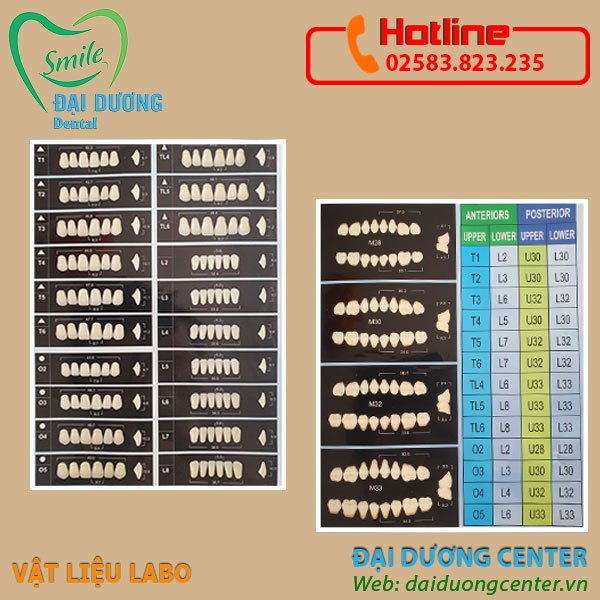 Hình dáng răng thẩm mỹ giống răng thật, chuẩn size châu Á, chất lượng cao, bền màu theo thời gian, màu sắc A1, A2, A3,A3.5, A4 theo bảng màu VITA.